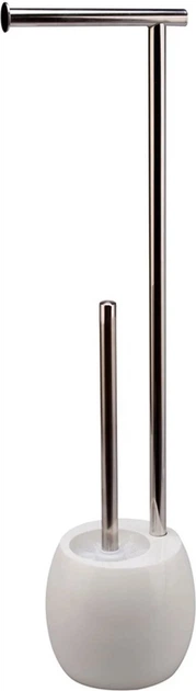 Stojak na akcesoria toaletowe Thema Lux — to nowoczesny i kompaktowy dodatek, przeznaczony do ustawienia na podłodze w łazience lub toalecie. Stojak jest wykonany z trwałego materiału poliżywicy (Polirezinas), co zapewnia jego długowieczność, i jest dostępny w harmonijnym połączeniu kolorów białego i szarego. Dzięki swojej wysokości i kompaktowej kwadratowej podstawie (), idealnie nadaje się do przechowywania niezbędnych akcesoriów, takich jak szczotka lub papier toaletowy, nie wymagając montażu i dodając nowoczesny akcent.