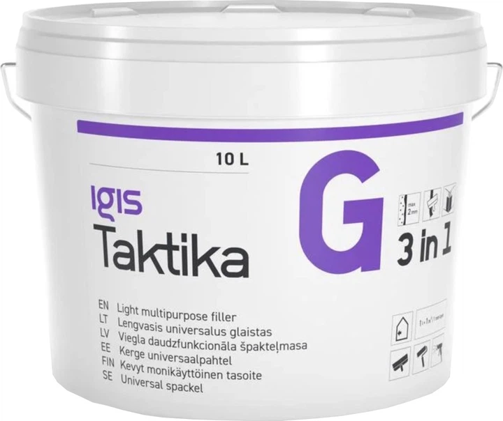 Igis Taktika G — to uniwersalna biała szpachlówka przeznaczona do wyrównywania ścian i sufitów wewnątrz pomieszczeń. Dzięki swojej konsystencji i właściwościom nadaje się zarówno do szpachlowania bazowego, jak i wykończeniowego, zapewniając równą i gładką powierzchnię pod dalsze wykończenie.