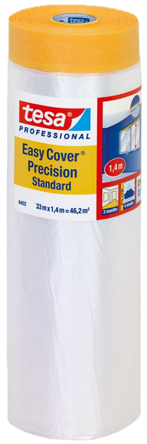 Folia ochronna Tesa 33 m × 140 cm to praktyczne rozwiązanie do zabezpieczania powierzchni podczas prac malarskich i remontowych. Produkt łączy folię ochronną z taśmą maskującą, dzięki czemu pozwala szybko przygotować miejsce pracy i dokładnie zabezpieczyć krawędzie oraz duże powierzchnie. Folia skutecznie chroni przed zachlapaniem farbą, a jednocześnie umożliwia uzyskanie czystych, równych linii malowania.