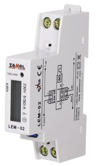 Однофазний трифазний лічильник для монтажу на DIN-рейку, пряме вимірювання, монтажна ширина 1TE, 230 В змінного струму, 5/50 А, імпульсний вихід S0 (1000 імп/кВт·год) 12-27 В, пломбувальний, без сертифікації.