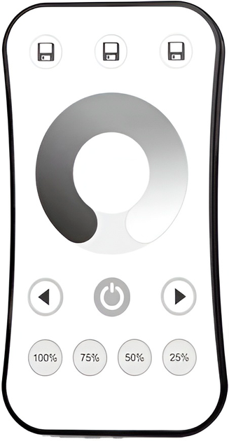 Bezprzewodowy pilot RF przeznaczony do sterowania jednokolorowymi taśmami LED. Umożliwia precyzyjną regulację jasności, zapis 3 scen świetlnych oraz wygodne sterowanie za pomocą dotykowego pierścienia.