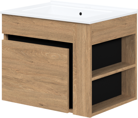 Korpus oraz front wykonano z laminowanej płyty meblowej w dekorze dąb złoty. Materiał jest odporny na wilgoć i łatwy w czyszczeniu, dzięki czemu dobrze sprawdza się w warunkach łazienkowych. Ciepły odcień drewna w połączeniu z czarnymi elementami tworzy wyrazisty kontrast, który wpisuje się w aranżacje nowoczesne i loftowe.