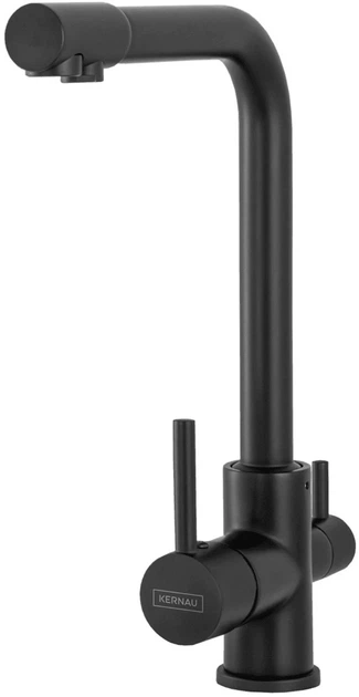 Кухонний змішувач Kernau Actea KWT 46 Матовий Чорний поєднує в собі стильний дизайн та виняткову функціональність, що робить його ідеальним вибором для сучасної кухні. Виконаний у чорній обробці, цей змішувач виготовлено з міцної латуні, що гарантує довговічність і стійкість до зношування. Висота змішувача становить 315 мм, а висота виливу - 285 мм, що разом з діапазоном виливу до 235 мм забезпечує зручність користування. Обертовий носик з поворотом на 360° дозволяє легко маніпулювати потоком води, що особливо зручно при використанні з двома чашами мийки. Тристороння система батареї разом з керамічною головою забезпечують точне регулювання води, а наявність аератора сприяє економії води. Змішувач також надає можливість підключення фільтра для води, забезпечуючи чистоту та безпеку вживаної води. Завдяки системі видалення накипу, догляд за змішувачем стає простіше, а розміри монтажного отвору 35 мм дозволяють без проблем встановити його в будь-якій кухні.