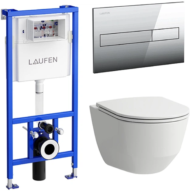 Zestaw zawiera: toaletę ścienną Laufen Pro New. Wytrzymałą pokrywę toaletową Laufen Pro Slim Soft Close z elementami mocującymi ze stali nierdzewnej, którą można łatwo zdjąć, naciskając uchwyty pokrywy, aby dokładniej ją wyczyścić. Niezawodny moduł wbudowany Laufen LIS szwajcarskiego producenta z płytką spłukującą Dual Flush w kolorze chromu.