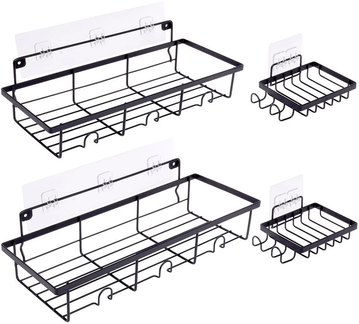 - УНІВЕРСАЛЬНІ - На полицях можна зберігати різні косметичні засоби та аксесуари, такі як гель для душу, шампунь, косметика, губки та щітки. Крім того, полиці оснащені гачками для підвішування губок, щіток або інших аксесуарів. Великі полиці мають три гачки, а малі - два. Полиці також можна використовувати на кухні як полиці для спецій.