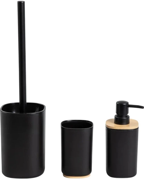 Набір для ванної кімнати Salti є елегантним і практичним у щоденному використанні. Глибокий матовий чорний колір у поєднанні з витонченими бамбуковими деталями створює елегантний комплект, який ідеально впишеться як в інтер'єр в індустріальному, лофт-стилі, так і в мінімалістичному. Це чудовий спосіб швидко і просто впорядкувати простір ванної кімнати.