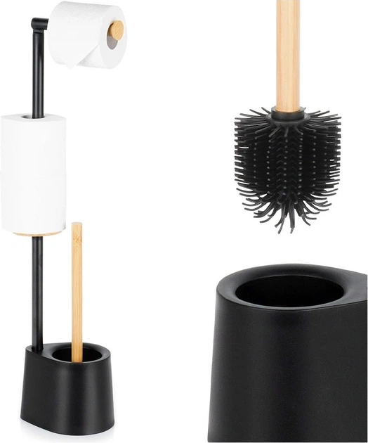 Багатофункціональна стійка для ванної кімнати від бренду Vilde з розмірами 14.5 x 12.5 x 66 см — це практичне рішення 2-в-1, що поєднує тримач для туалетного паперу та щітку для унітаза в одній компактній конструкції. Виріб виготовлений із міцного чорного пластику та металу, а бамбукова ручка щітки додає елегантного вигляду. Інноваційний верхній тримач може використовуватися як для розгортання паперу, так і у вертикальному положенні як місце для додаткового рулону (збільшуючи висоту стійки до 79.5 см). Вертикальний стрижень дозволяє зручно зберігати три запасні рулони, забезпечуючи порядок у вбиральні.