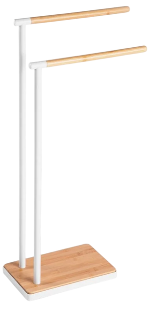 Потрібен практичний аксесуар для ванної кімнати, який буде одночасно сучасним і стильним? Стійка для рушників FRAZ — ідеальний варіант. Вона має два рівні для підвішування рушників, що дозволяє зручно сушити їх і організувати простір. Поєднання білого металу з деревом надає їй природного і легкого характеру.