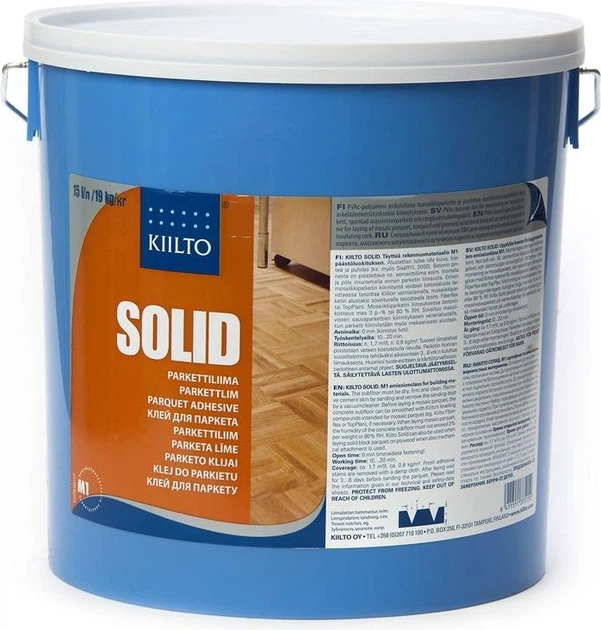 Kiilto Solid – це готовий до використання однокомпонентний клей, спеціально розроблений для склеювання паркету та дерев'яних поверхонь. Розроблений та виготовлений у Фінляндії, продукт гарантує найвищу якість та надійність.