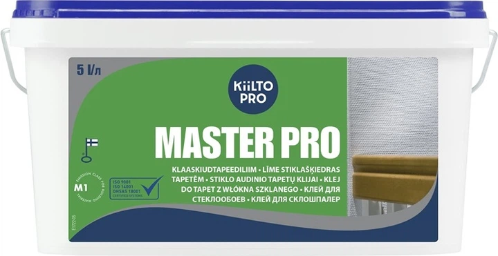Клей Kiilto Pro Master призначений для приклеювання міцних нетканих шпалер, а також пористих або пофарбованих поверхонь. Його можна наносити вручну або машинним способом. Також підходить для попереднього зволоження паперових шпалер.