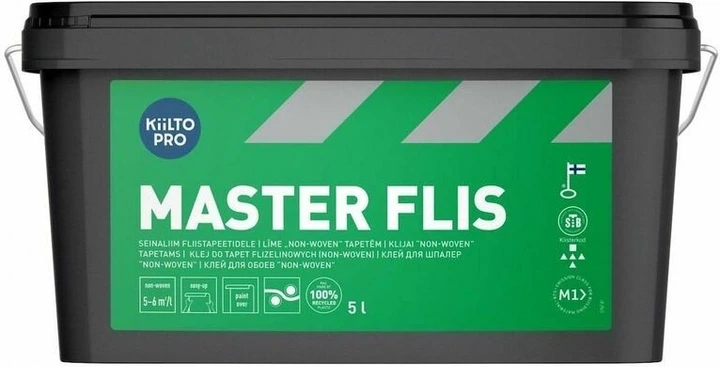 Клей Kiilto Pro Master Flis призначений для приклеювання стійких флізелінових шпалер, а також пористих або пофарбованих поверхонь. Його можна наносити вручну або машинним способом. Також підходить для попереднього зволоження паперових шпалер.